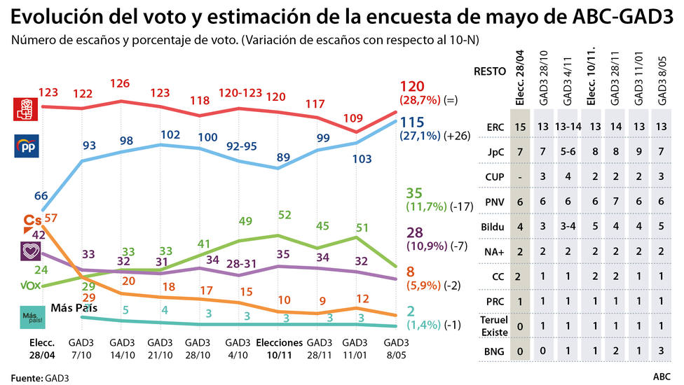 El PSOE se mantiene con los 120 escaños que consiguió en las pasadas elecciones del 10 de noviembre, pero como aventuran el propio director de GAD3, Narciso Michavila, “Esta es solo la primera encuesta, hay una auténtica convulsión de voto, con mucho movimiento y volatilidad. Pero la carrera solo acaba de comenzar”, subrayando un panorama futuro de importantes cambios respecto a los porcentajes electorales.