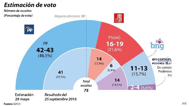 En La Coruña, los populares conseguirían llegar a los 14 -un escaño más de los que tienen ahora mismo-, en Lugo disputarían la novena acta (frente a las 8 actuales) y mantendrían el mismo resultado en Orense (9) y Pontevedra (11), con una estimación de voto total del 48,5%.