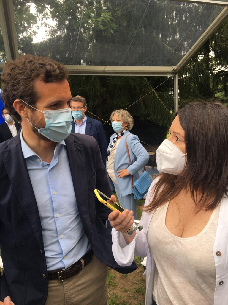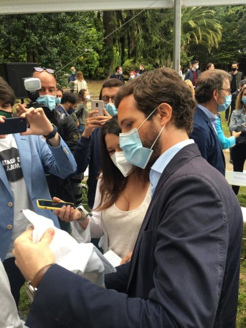 Este primer gran acto se ha celebrado en una finca de Santiago, al aire libre, con un aforo limitado a cien personas, y sillas colocadas a un metro y medio de distancia entre sí. Desde allí, se ha conectado en directo con los candidatos de las cuatro provincias gallegas, que han participado por videoconferencia. Casado estará presente seis días en la campaña gallega, y otras tantas en la vasca.