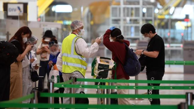 Un empleado sanitario verifica la temperatura de pasajeros de un vuelo con destino a Pekín, aeropuerto de Barajas, Madrid, 20 de junio de 2020.