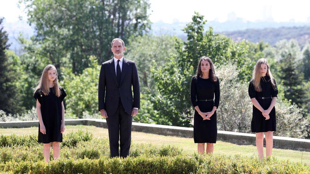 Los Reyes, junto a sus hijas, durante el minuto de silencio por los fallecidos por la pandemia en el primero de los diez días de luto oficial que en mayo decretó el Gobierno