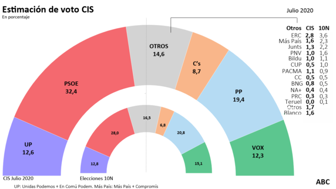 También llama la atención que, en un momento en que los rebrotes de coronavirus están volviendo a complicar la situación en varios puntos del territorio, la gestión de la pandemia no pase factura al Gobierno. Tanto PSOE como Unidas Podemos mejoran sus resultados pese a que no se había concretado el acuerdo económico de reconstrucción económica en Europa -anunciado el 21 de julio- del que presumió Pedro Sánchez, pero sí se había constatado la debacle electoral de la formación de Pablo Iglesias en el País Vasco y Galicia.