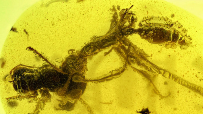 Se trata de un fósil que estaba dentro de un ámbar hallado en Birmania, permite ver con todo detalle a esa hormiga prehistórica y es una prueba directa de cómo empleaba sus mandíbulas en forma de guadaña para realizar un movimiento vertical con el que inmovilizaba a las víctimas contra sus apéndices.