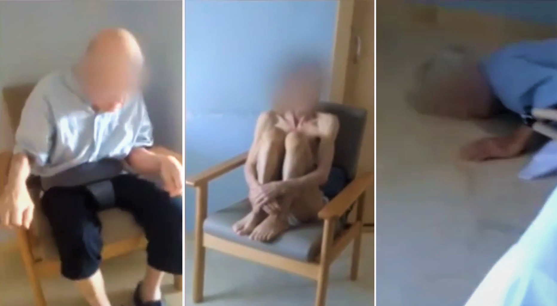 En estas imágenes, emitidas este martes por Telecinco, se puede ver a varios ancianos atados a sillas y con llagas o desnudos a quienes se deja desatendidos para comer e incluso tras caer al suelo.