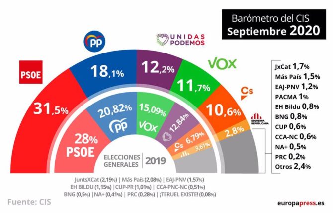 Según el barómetro de septiembre del CIS, elaborado entre el 1 y el 7 de este mes, el PSOE obtendría un 31,5 por ciento en estimación de voto -nueve décimas menos que a finales de julio- en tanto que el PP pierde más de un punto y se queda en el 18,1 por ciento, su nivel más bajo en un año.