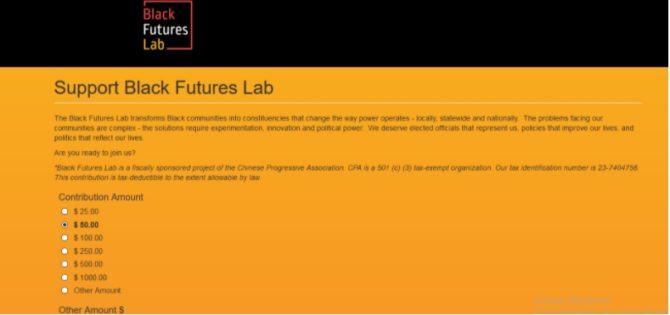 Cuando se entra a la opción «donate», el sitio automáticamente dirige al usuario a una ventana con los montos para contribuir a la organización. En esa página, literalmente, aparece la Asociación Progresista de China (CPA por sus siglas en inglés) como patrocinador fiscal del proyecto Black Futures Lab.