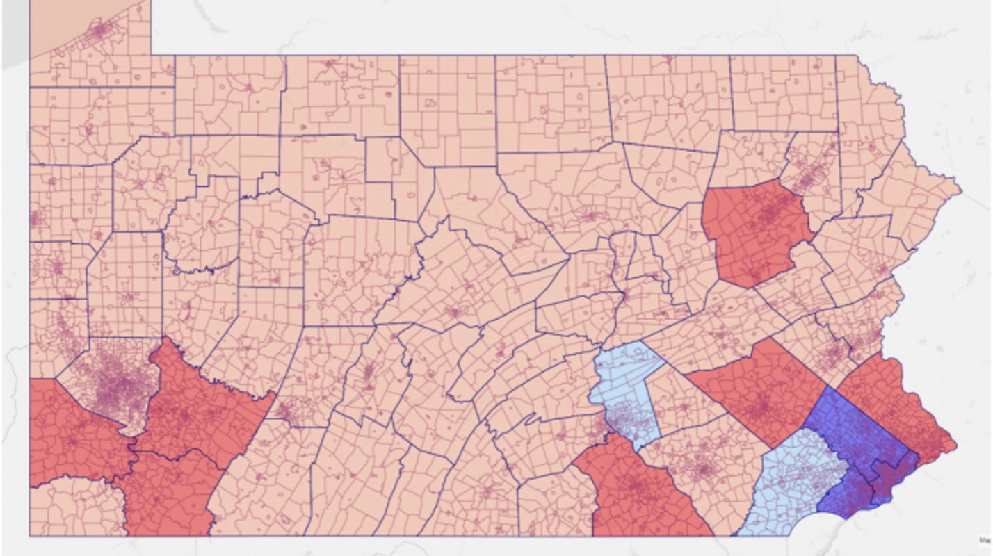 Los condados con más registro de votante republicano están en el suroeste (donde vive un tercio de toda la población del Estado) y noreste (donde Trump ganó abrumadoramente en 2016), además de las áreas urbanas de Pittsburgh y Filadelfia.