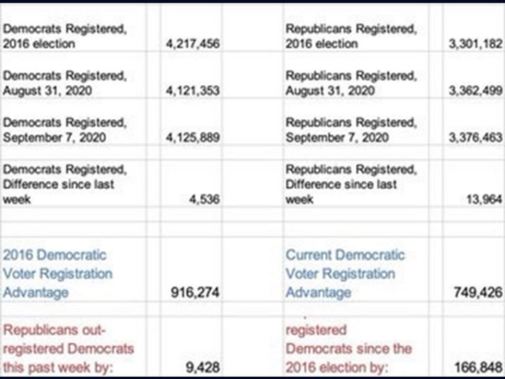 Los datos de registración de votantes republicanos para la elección de noviembre 2020 desde la primera semana de agosto supera a la registración demócrata: