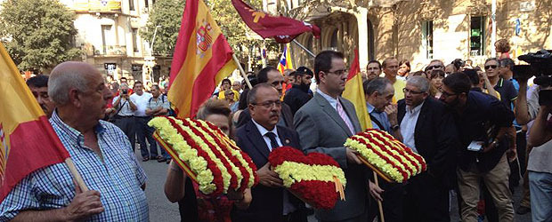 Gerard Bellalta, en el centro, portando una bandera española en la ofrenda floral a Rafael de Casanova.