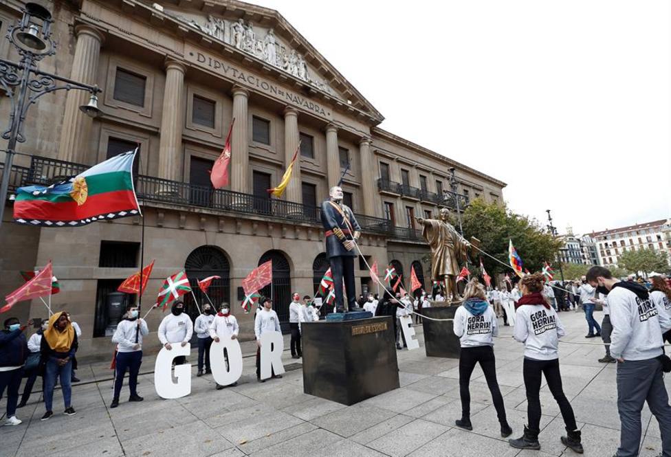 Dos figuras representando al rey Felipe VI y Cristobal Colón han sido colocadas en dos pedestales ante el Palacio de Navarra, sede del Gobierno foral, y una vez sobre ellos les han puesto sendas sogas al cuello de las que varias personas han tirado hasta derribarlas y decapitarlas mientras sonaba “L’Estaca”.