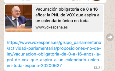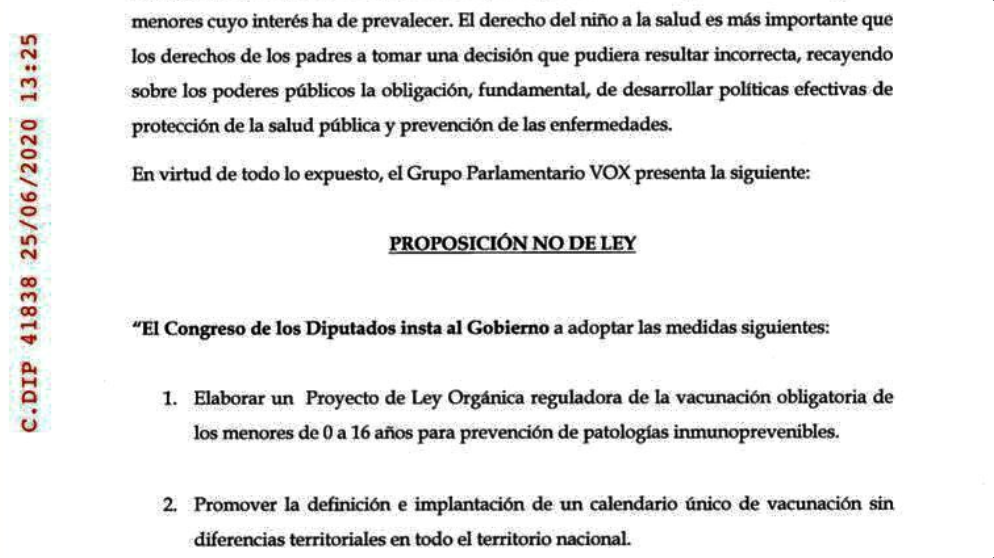 VOX presentó el pasado 25 de junio una PNL (Proposición No de Ley) en el congreso. Cobardeando, la retiró. Pero volverán a la carga. La Mafia Médica que ha vampirizado al partido verde asevera que están replanteándose la forma de abordar el “problema”. Para hacerlo, aún, claro, todo mucho más totalitario. ¿Más liberticidio puede llegar a haber que la vacunación forzosa a los niños amparándose en el artículo 43 de la Constitución que “consagra el derecho a la protección de la salud”? VOX, a través del tirano Juan Luis Steegmann considera que “hay determinadas situaciones en las que podría imponerse la vacunación forzosa” (sic).