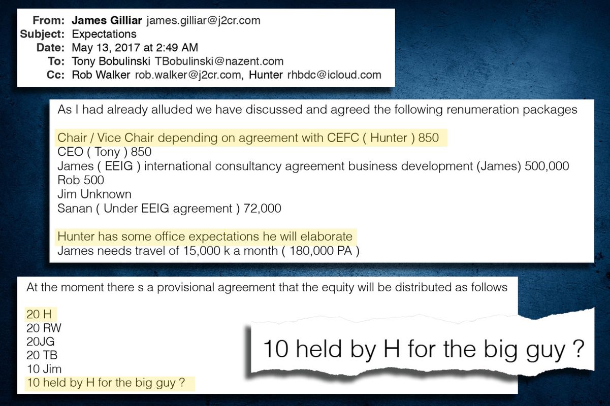 Bobulinski indica que fue contactado por Gilliar para unirse a un acuerdo entre la empresa estatal china de energía CEFC y lo que Gilliar llamó “una de las familias más prominentes de los Estados Unidos”. Dicha empresa china fue fundada por Ye Jianming, un magnate intrínsecamente ligado al Partido Comunista Chino, que participó en numerosos acuerdos de negocios con Hunter Biden.