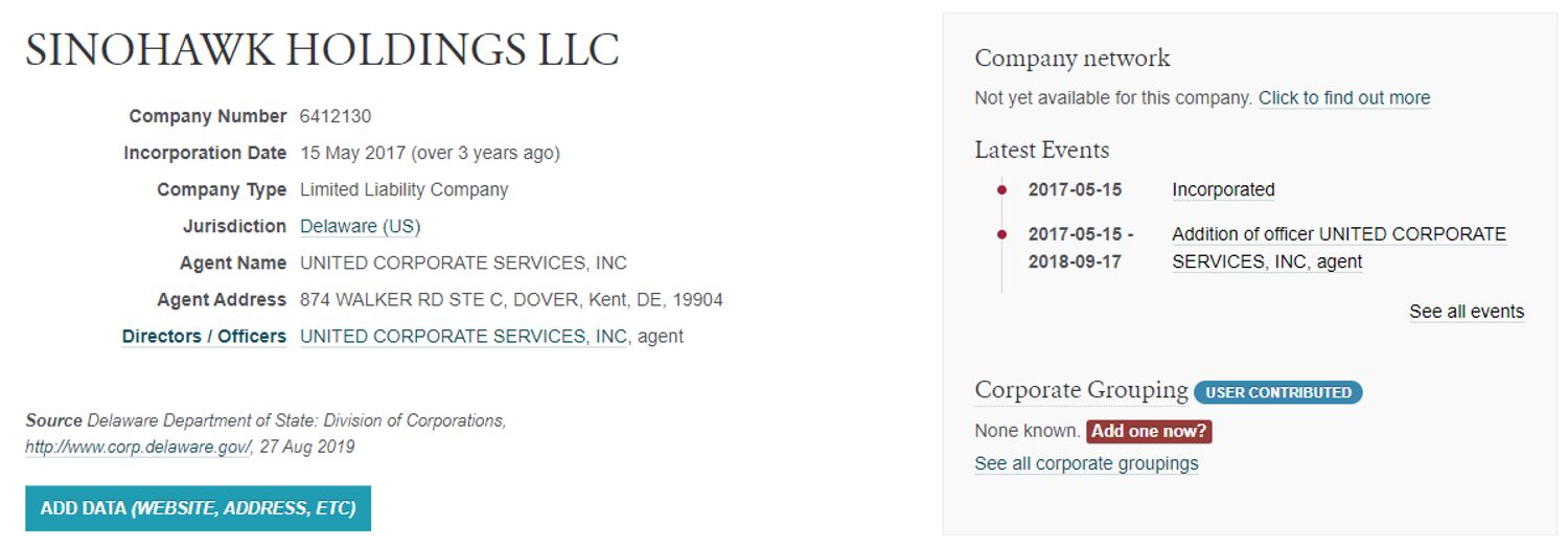 Registros oficiales del Estado de Delaware confirman que Sinohawk Holdings fue registrada el día 15 de mayo de 2017, tan solo 2 días después del mencionado correo.