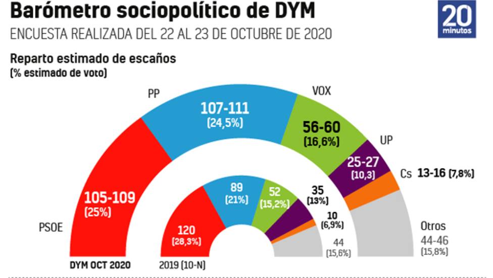 Ese giro viene dado por lo ganado por Pablo Casado durante su discurso el pasado jueves, que se traduce en una intención de voto a favor del líder del Partido Popular del 24,5%, lo que en escaños se traduciría en 111 en la horquilla más alta.