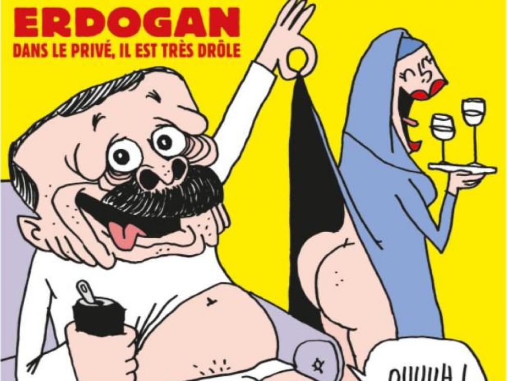 La caricatura muestra a Erdogan con camiseta interior y calzoncillos, levantando la falda de una mujer que va cubierta con un hábito islámico.