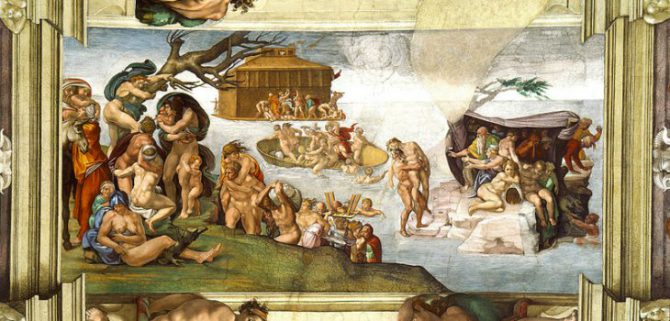 Christopher Fleming (R).- Hasta el Concilio Vaticano II (es decir, hasta hace unos 50 años), la Iglesia Católica se definía como el Arca de Salvación, en alusión al arca de Noé y el diluvio universal. De la misma manera que sólo las ocho personas a bordo del arca sobrevivieron el Castigo Divino en tiempos de Noé, en el Día del Juicio solamente los que se encuentran dentro de la verdadera Iglesia fundada por Jesucristo (la Iglesia Católica, por supuesto), se librarán de la ira de Dios. San Cipriano, haciendo eco de las palabras de San Pedro en su primera carta, habla del Diluvio como el “bautismo del mundo”, para lavarlo de su pecado y empezar de nuevo. San Agustín, en La Ciudad de Dios, hace una observación interesantísima: las medidas del arca que Dios da a Noé corresponden a las de un cuerpo humano, cuya longitud suele ser seis veces su anchura. Dice este santo que de esta manera el arca es una figura aún más perfecta del Cuerpo de Cristo, la Iglesia Católica, fuera de la cual nadie se puede salvar.