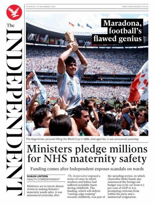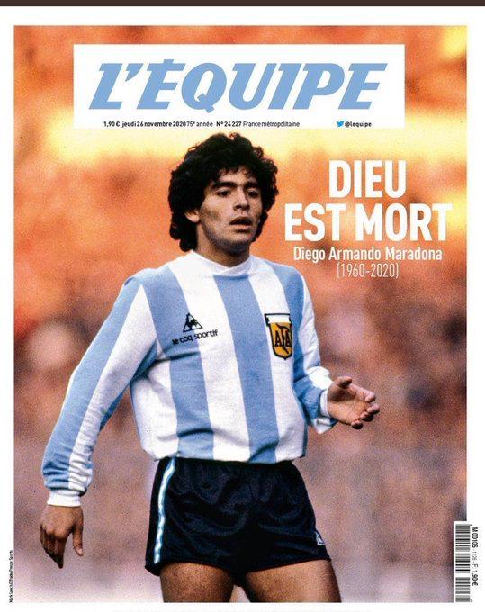 También se hacen eco la prensa francesa y la inglesa. El prestigioso diario deportivo L’Équipe abre su edición de este jueves con un homenaje a su fallecimiento: “Dios ha muerto” (Diego Armando Maradona 1960-2020), y ensalza en sus páginas un jugador de excepción, “personaje inimitable y genio autodestructor”. El principal periódico deportivo francés dedica la mitad de su edición a recordar al argentino, al que describe como un hombre llegado de la calle que registró logros “inmensos” pero que vivió “atraído por las tinieblas”, y habla también de sus relaciones políticas con el socialismo latinoamericano, su paso por Nápoles y sus proezas en el Mundial de 1986.