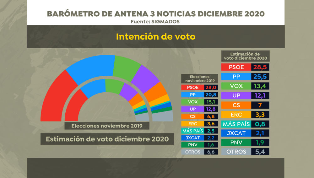 El PSOE obtendría ahora el 28,5% de los votos, medio punto más que en las elecciones de noviembre de 2019, pero el PP recortaría distancias y conseguiría el 25,5% de los votos, casi cinco puntos más que en los anteriores comicios.