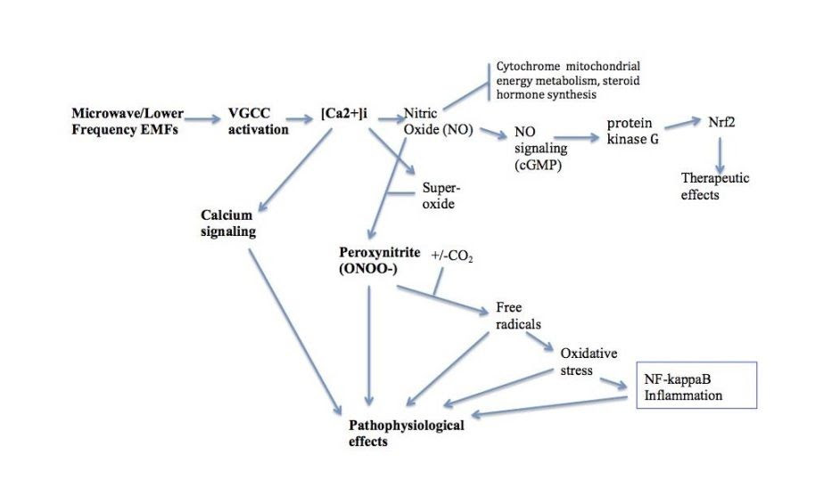 Se pueden explicar grandes cantidades de efectos Electromagnéticos fisiopatológicos no térmicos a través de la acción de Activación de VGCC producida por dos vías de acción diferentes que se muestran en la Fig. 1 a continuación: el calcio vía de señalización y la vía peroxinitrito / radical libre / estrés oxidativo / inflamación.