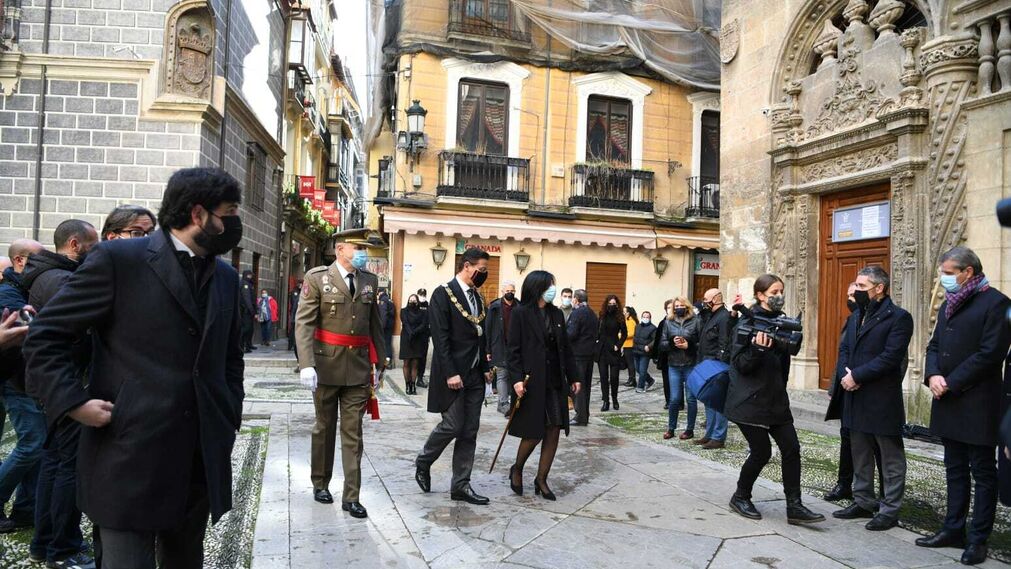 Pocos minutos después, el alcalde, la subdelegada y el teniente general del Madoc iniciaron el recorrido hasta la Capilla Real. Lo hicieron por la acera, por Reyes Católicos arriba hacia el Zacatín, sólo acompañados de personal de seguridad y protocolo. A los pocos minutos ya estaban en el acceso a la Capilla Real, donde les esperaban los portavoces municipales: Manuel Olivares (Cs), César Díaz (PP), Raquel Ruz (PSOE) y Onofre Miralles (Vox). Fueron recibidos por el capellán mayor de la Capilla Real, Manuel Reyes.