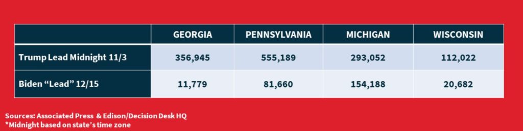 En Pensilvania, su ventaja era de 555.189 votos; en Georgia, de 356.945; en Michigan, de 293.052 y en Wisconsin, de 112.022 votos. Todas esas ventajas desaparecieron cuando a la madrugada comenzaron a llegar los votos por correo que el servicio postal todavía no había llegado a recolectar antes del día 3.