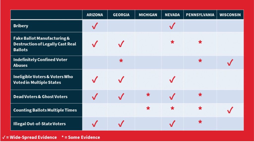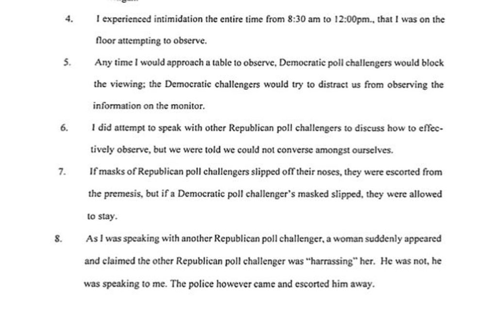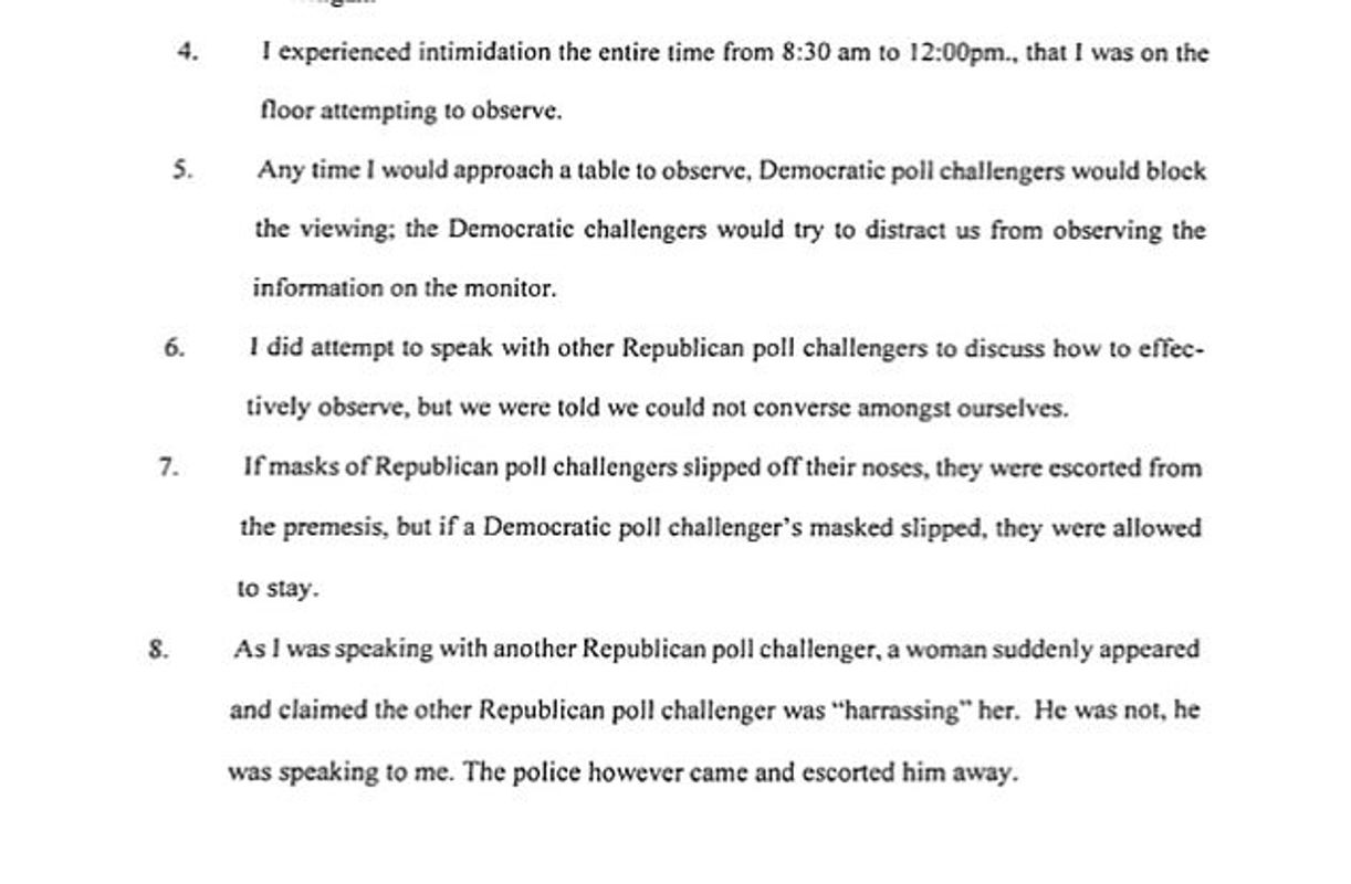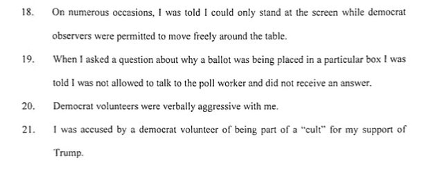 Solamente en las demandas presentadas por el equipo legal oficial de Trump, hubo casi 300 fiscales de mesa y observadores republicanos que testificaron que vieron fraude electoral. Tomando de las declaraciones bajo juramento de personas como Braden Giacobazzi, Jacqueline Zaplitny, y Alexandra Seely, las autoridades electorales de Pensilvania, Michigan, Wisconsin y Georgia tenían un sesgo anti-Trump, que se notó en toda la jornada del recuento de votos.