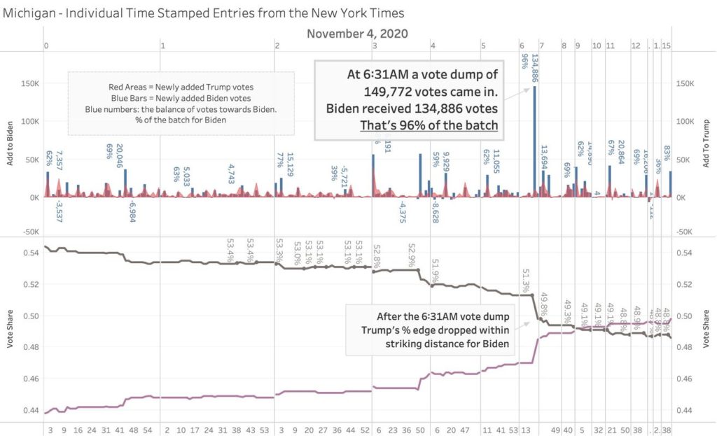 Estas estadísticas no tienen sentido en una elección en Estados Unidos: ni en las dictaduras africanas el dictador de turno es electo con el 96% de los votos. De hecho, en las demás discretizaciones de los lotes de votos de Michigan, Biden nunca obtuvo más del 70% del voto por correo.