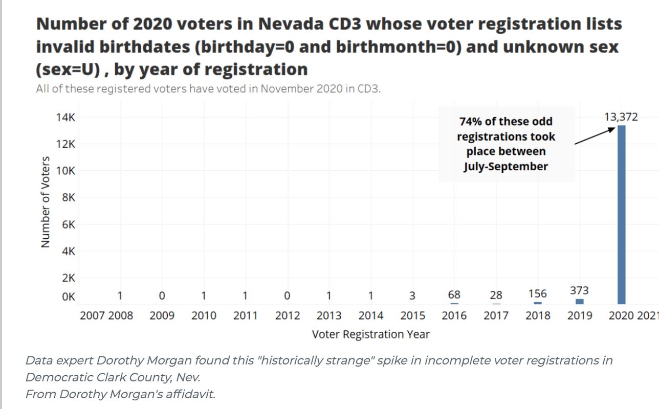 Una investigación liderada por el ex-Fiscal General del Estado, Adam Laxalt, que puso el foco en el condado ultra-demócrata de Clark (lugar donde Biden obtuvo la mayor cantidad de votos), muestra que más de 1.500 personas muertas votaron en la elección, 2.468 personas lo hicieron de manera ilegal desde otros Estados, 42.000 votos fueron emitidos de manera doble —por correo y presencialmente—, y alrededor de 20.000 personas votaron desde una dirección falsa.