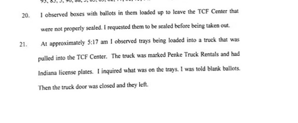“Observé que cargaron cajas a un camión de Penke Truck Rentals con patente de Indiana” -estando en Michigan; los votos solo pueden ser manipulados por empleados del Correo nacional-. “Me dijeron que las cajas tenían boletas en blanco”