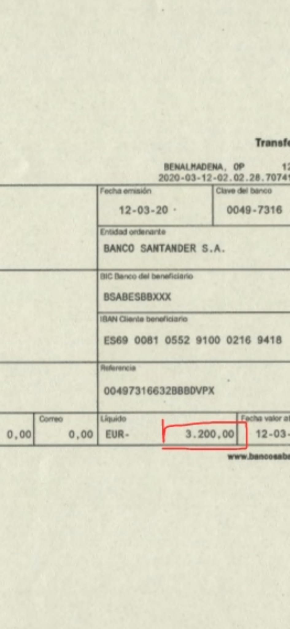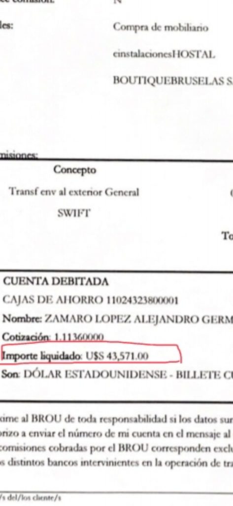 Alejandro Zamaro ha presentado a nuestra redacción nuevas pruebas de las transferencias hechas desde Argentina a Fernando González. Se trata de 43.571,00 dólares en concepto de compra de mobiliario e instalaciones del Hostal Boutique Bruselas, así como 3.200 y 9.9053,71 dólares, en concepto de aportación y préstamo para la cuenta del establecimiento.