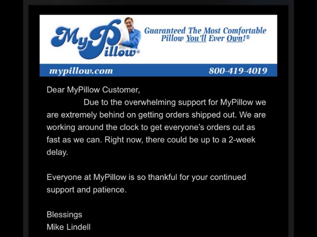 Según notaron muchos de sus clientes, MyPillow está teniendo retrasos de hasta dos semanas para entregar los pedidos (usualmente era menos de 2 días) debido a la explosión de compras que tuvo la empresa a través de su página web desde que Mike Lindell se viralizó en redes por su apoyo a Trump.