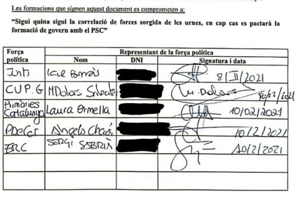 Durante toda la campaña, las diferentes fuerzas independentistas se han centrado en sus discursos y no han buscado una línea de actuación conjunta, pero en pocas jornadas han querido dejar muy claro a Salvador Illa que no están dispuestos a pactar con él, a través de las firmas estampadas en este escrito.