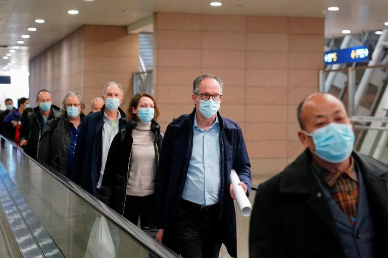 Peter Ben Embarek y otros miembros del equipo de la Organización Mundial de la Salud (OMS) encargado de investigar los orígenes de la enfermedad del coronavirus (COVID-19) llegan al aeropuerto internacional de Pudong en Shanghái, China.