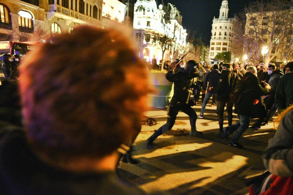 Durante la protesta, se han coreado mensajes como “esto es una mafia”; “lo llaman democracia y no lo es, es una dictadura y lo sabéis”; “Hasel, amigo, Valencia está contigo”; “llibertat presos polítics” y “Valencia es antifeixista”. La concentración ha acabado con algunas cargas policiales e incidentes, como el vuelco y quema de contenedores en las inmediaciones de la plaza del Ayuntamiento.