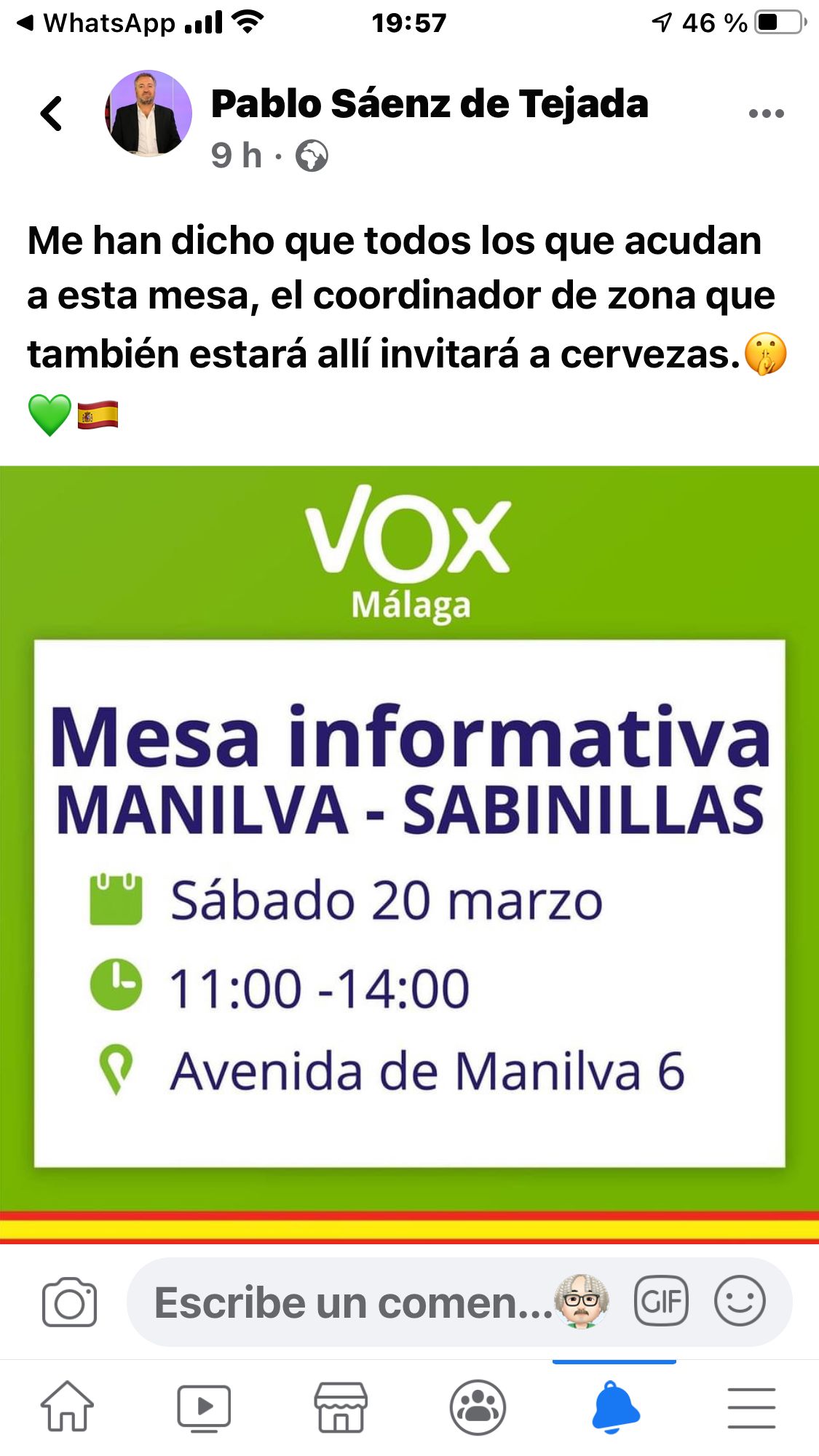 Esto es lo que ha revelado el ex candidato de Vox al Senado por el partido verde, Pablo Sáenz de Tejada. El próximo sábado está prevista una de estas mesas informativas en la localidad costasoleña de Manilva-Sabinillas. “Me han dicho que todos los que acudan a esta mesa, el coordinador de zona que también estará allí invitará a cervezas”, ha escrito en redes sociales Sáenz de Tejada, un acaudalado rentista aficionado a la caza, a los caldos añejos y al buen yantar.