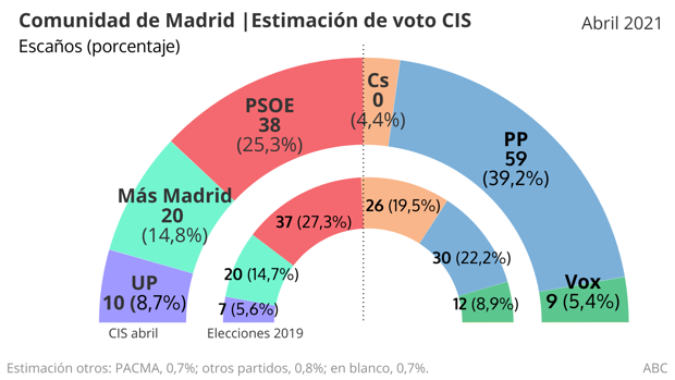 El Centro de Investigaciones Sociológicas (CIS) otorga una holgada victoria al PP que doblaría su representación en la Asamblea de Madrid al pasar de 30 a 59 escaños, aunque insuficiente para garantizarse el Gobierno y con un virtual empate entre los bloques de izquierda y derecha a 68 diputados.