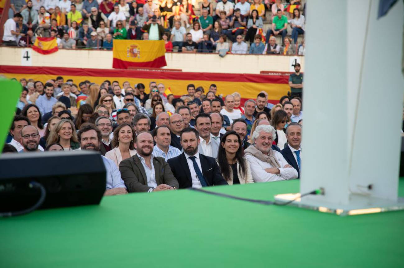Antonio Corrales entre Santiago Abascal e Iván Espinosa de los Monteros o Rocío Monasterio durante un mitín de la formación en la Plaza de Toros de Valdemoro. / Vox