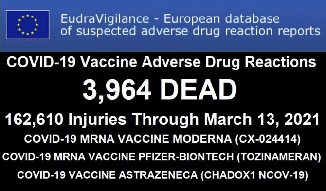 Los datos oficiales de la UE sobre muertes y efectos secundarios graves de las vacunas Pfizer, Moderna y AstraZeneca muestran: 3.964 muertes y 162.610 efectos secundarios graves (27 de diciembre de 2020 – 13 de marzo de 2021).