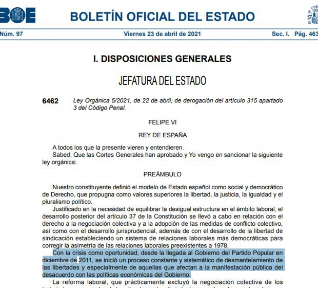 El Boletín Oficial del Estado publica este viernes la Ley Orgánica 5/2021, que deroga el artículo del Código Penal que incluía las penas de cárcel entre los castigos a los piquetes violentos de las huelgas. Lo llamativo es que el preámbulo de la ley acusa directamente al Gobierno de Mariano Rajoy de «un proceso constante y sistemático de desmantelamiento de las libertades».