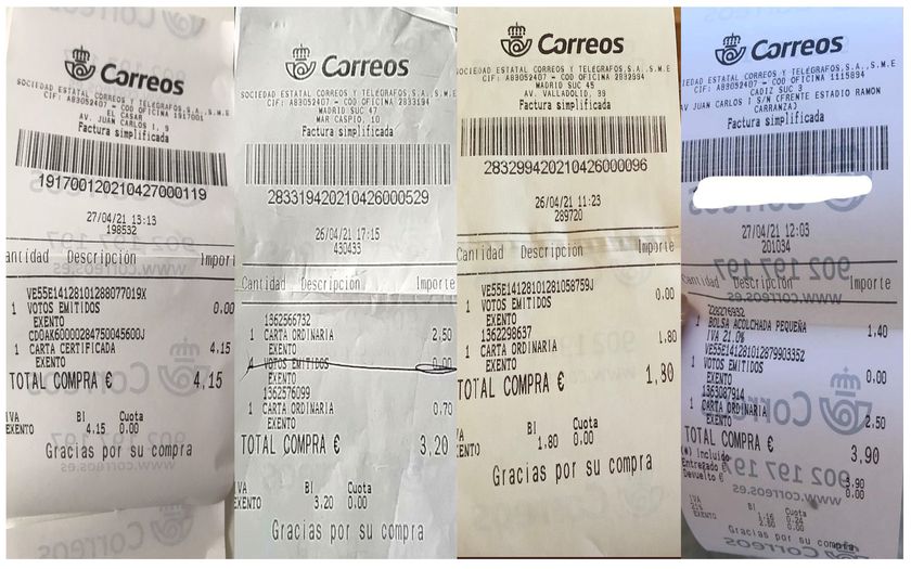 Varios de los tickets de ciudadanos que no votaron por correo que han compartido por las redes sociales