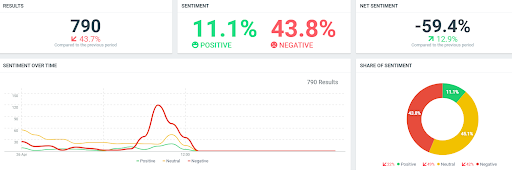 El sentimiento negativo es de un 31,7%. Mientras, que el positivo es de solo un 9,6%. Esto provoca un sentimiento neto de -53,5%.