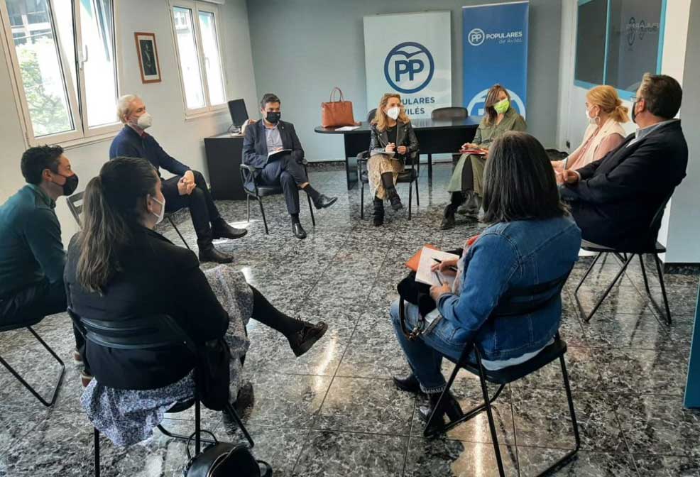 Declaraciones que la presidenta del PP de Asturias realiza tras haber estado reunida el pasado viernes en la sede del PP de Avilés, con representantes del sector hotelero de la zona, junto al portavoz adjunto del Grupo Parlamentario Popular Pablo González, el presidente del PP de Avilés, Pedro de Rueda, y a la portavoz municipal Esther Llamazares.