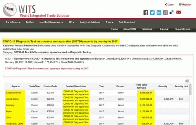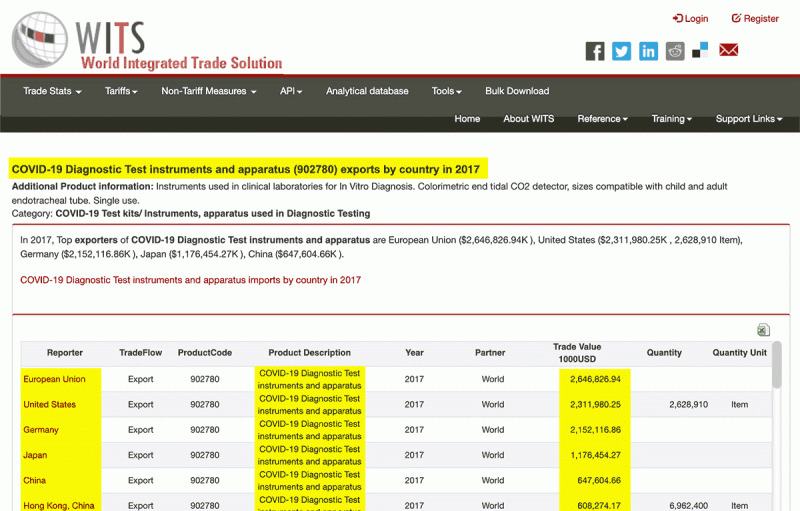WITS. World Integrated Trade Solution. Leamos. Web oficial. “En 2017 y 2018 – dos años antes de la denominada covid-19 – cientos de millones de kits de test para la enfermedad covid-19 fueron vendidos en todo el mundo”.