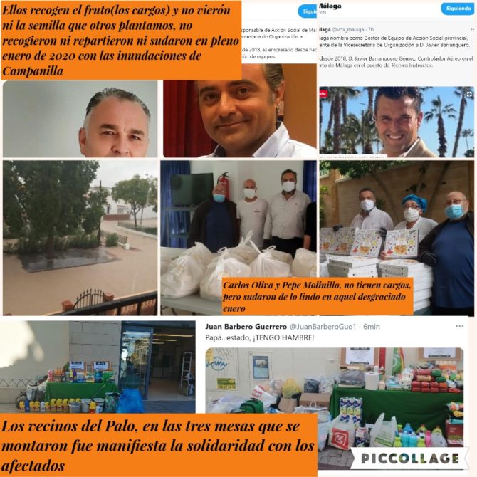 ¿Recuerdan aquella trágica tormenta del mes enero del año pasado, que hizo desbordarse el río, inundando la localidad de Campanilla y dejando tantos damnificados sin nada que ponerse ni llevarse a la boca? En aquel trágico día casi sin pensarlo, el Comité Provincial de Vox en Málaga, el de antes no el de ahora, nos pusimos a trabajar, se formó el grupo de acción social “Amigos de Vox Málaga”. Se organizaron recogidas de alimentos, enseres, ropas, muebles, todo era necesario, nada tenían en Campanillas. Se organizó una recolecta para la adquisición de alimentos, pizzas, bocadillos, etc., que con el virus circulando, repartieron sin miedo los Amigos de Vox Málaga.