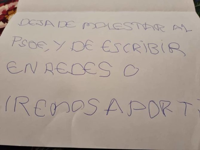 “He bajado al buzón a por las cartas y… ¡sorpresa! Tenía un regalito de alguien que se ve que no le gusta la libertad de expresión. Pues si, me han amenazado y coaccionado de manera anónima claro porque decirlo a la cara les debe de costar mucho. No sé si así piensan que voy a callarme o a dejar de defender lo que creo, voy a dejar de publicar o van a mantenerme callada pero vamos ya les digo yo que NO. Ni de coña me callan las amenazas, ni voy a ceder a nada ni a nadie. Esto solo me dice que estoy haciendo bien las cosas, porque si tanto molesta lo que hago es que duele y si duele cura señores. La libertad de expresión está en decir las cosas con respeto y sin faltar a nadie, nunca he faltado ni he amenazado a nadie. El que piense que con esto voy a tener miedo y voy a dejar de ser quien soy es que me conoce poco. Libertad de expresión sin coacción!!!!!”