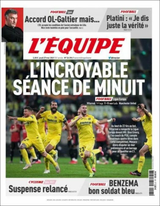 En Europa, la machada del Villarreal también es reconocida en diarios prestigioso como ‘L’Équipe: “El Villarreal es sagrado”, titula el medio francés. La Gazzetta italiana no se queda atrás: “El Villarreal entra en la historia, la Europa League es suya”. Hasta The Sun, periódico británico, cita la épica del Submarino, a pesar de jugar contra el Manchester. “Golpe para los Red Devils cuando De Gea falló un penalti en un tiroteo épico”, apunta The Sun.