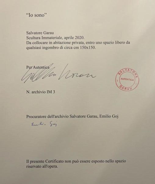 Físicamente, el comprador de ‘Io sono’ sólo recogerá el certificado de garantía, firmado y sellado por el artista que da fe de la obra archivada y representa el único elemento visual presente en el catálogo impreso de la subasta organizada por Art-Rite. En lugar de la imagen tradicional de una obra tangible, con el número 71 del catálogo, en un espacio en blanco absoluto aparece esta descripción de la escultura: «Io sono. 2020 [año de ejecución]. Escultura inmaterial para colocar en una casa particular dentro de un espacio libre de cualquier estorbo. Dimensiones variables, aproximadamente 150 x 150 cm».