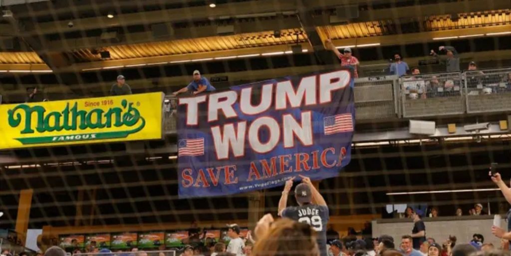 MF.- Entre aplausos y abucheos, simpatizantes del expresidente Donald Trump exhibieron una pancarta gigante que decía «Trump ganó, salvemos a EE. UU.» durante un partido de béisbol y fueron expulsados del estadio de los Yankees.