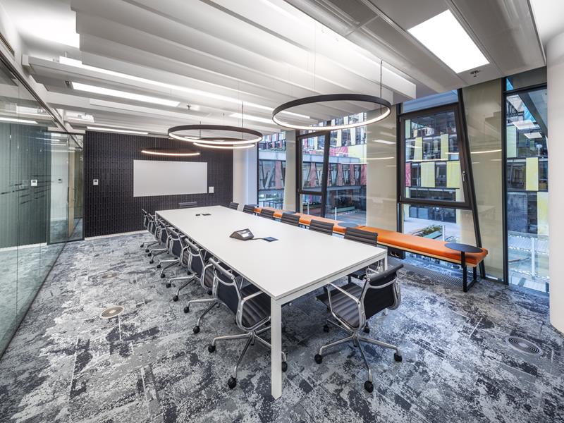 − Aislamiento acústico: importante tanto para la interacción audio/visual de dentro de la sala como para garantizar la privacidad con respecto al exterior cuando se tratan asuntos confidenciales. En casos donde las paredes solo se extienden hasta la altura del falso techo, se debe tener especial cuidado para maximizar el aislamiento acústico de los espacios adyacentes a través del plenum.
