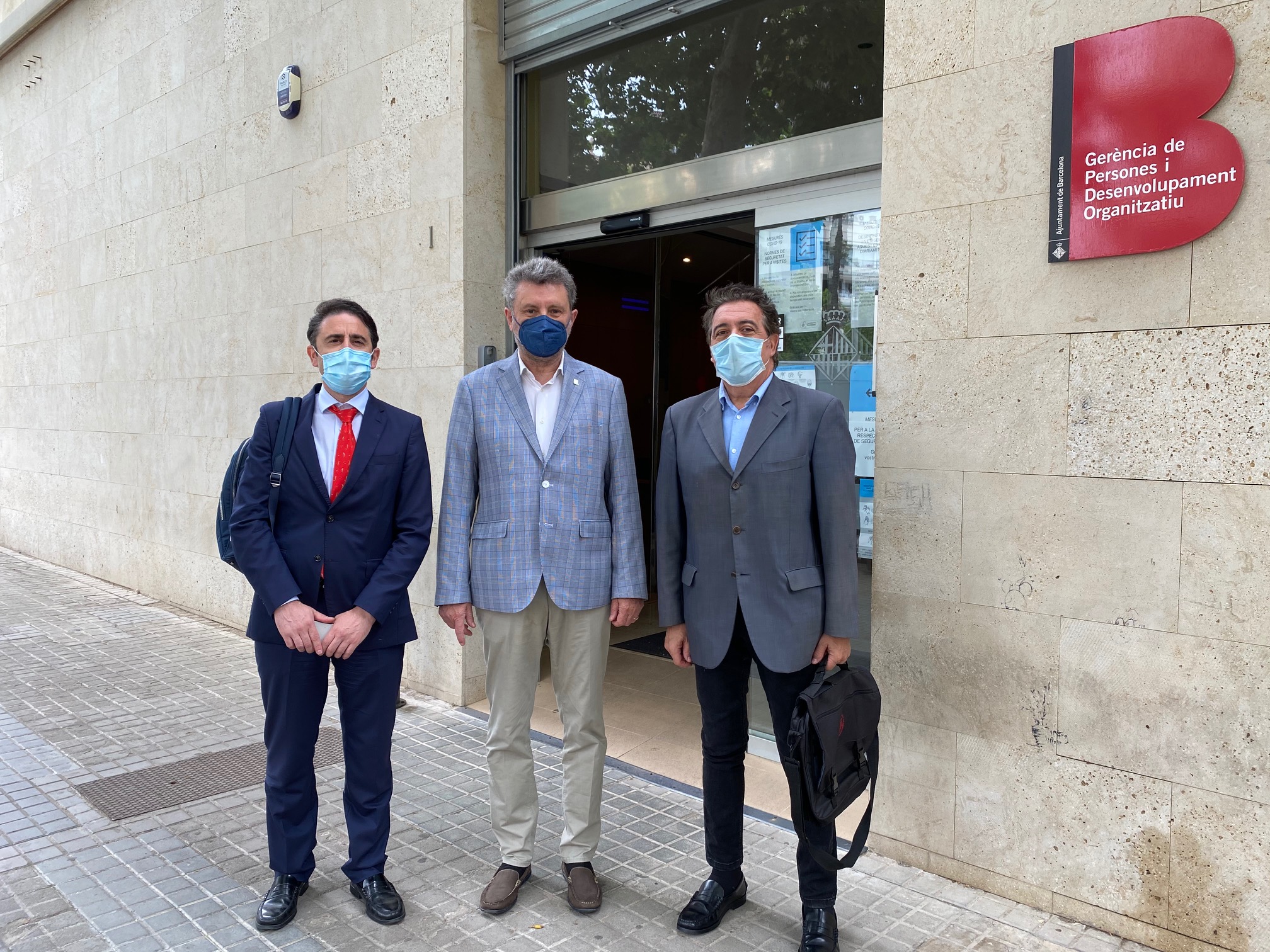 El presidente de INGITE, José Antonio Galdón, el decano del Colegio de Ingenieros Graduados e Ingenieros Técnicos industriales de Barcelona y presidente de METGEC, Miquel Darnés, y el asesor jurídico Juan Gracia, se han reunido con el gerente de Personas y desarrollo organizativo de la Ayuntamiento de Barcelona, Javier Pascual, para abordar la polémica sobre la convocatoria de plazas de técnico superior en ingeniería del Ayuntamiento de Barcelona, un concurso de oposición publicado el 10 de marzo que inicialmente estaba abierto a todos los graduados en ingeniería y que ha sido suspendido provisionalmente a causa de las alegaciones presentadas por cuatro Colegios profesionales de ingenieros de segundo ciclo, tradicionalmente llamados “superiores”.